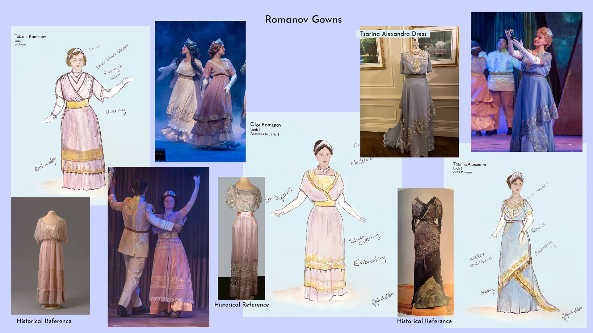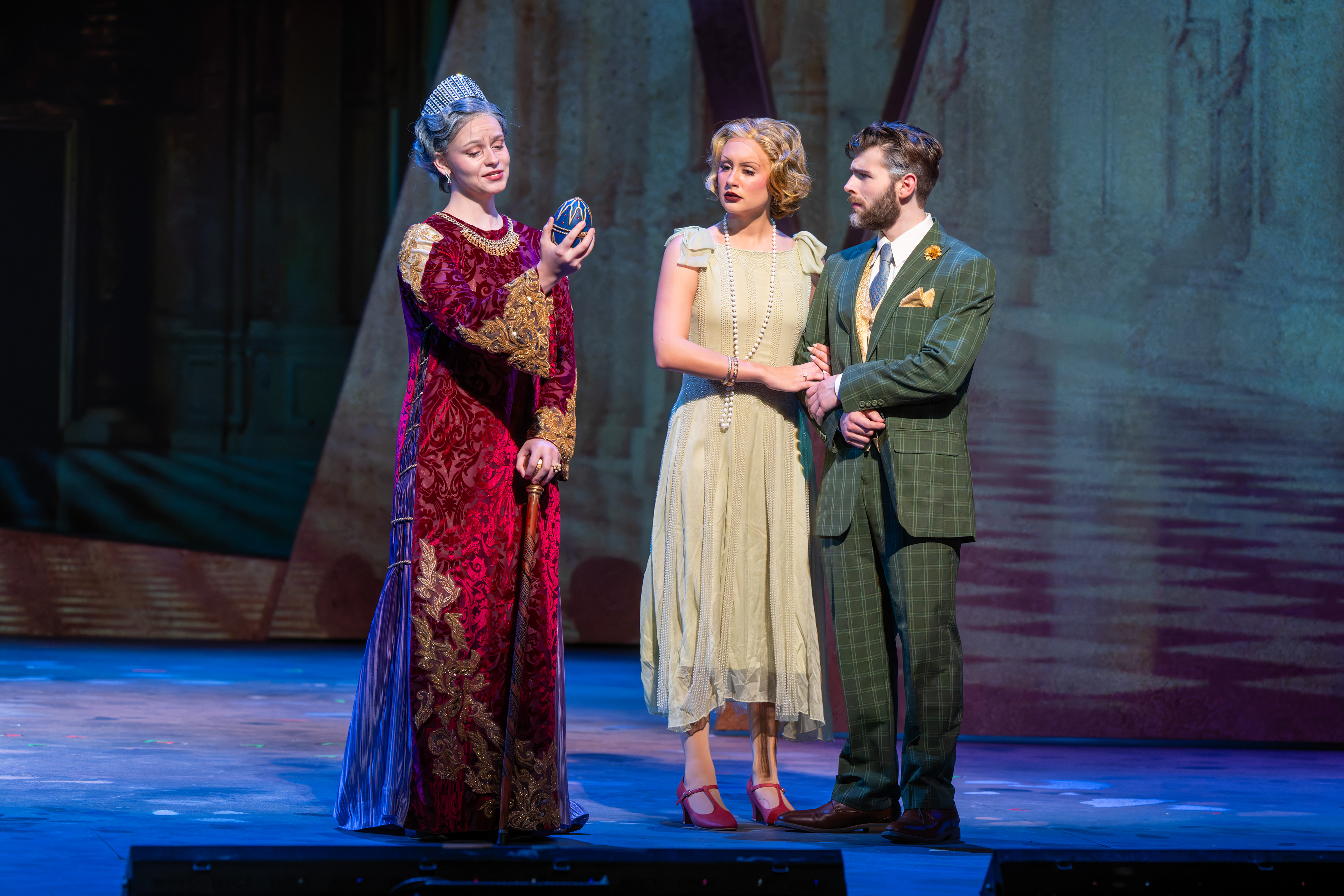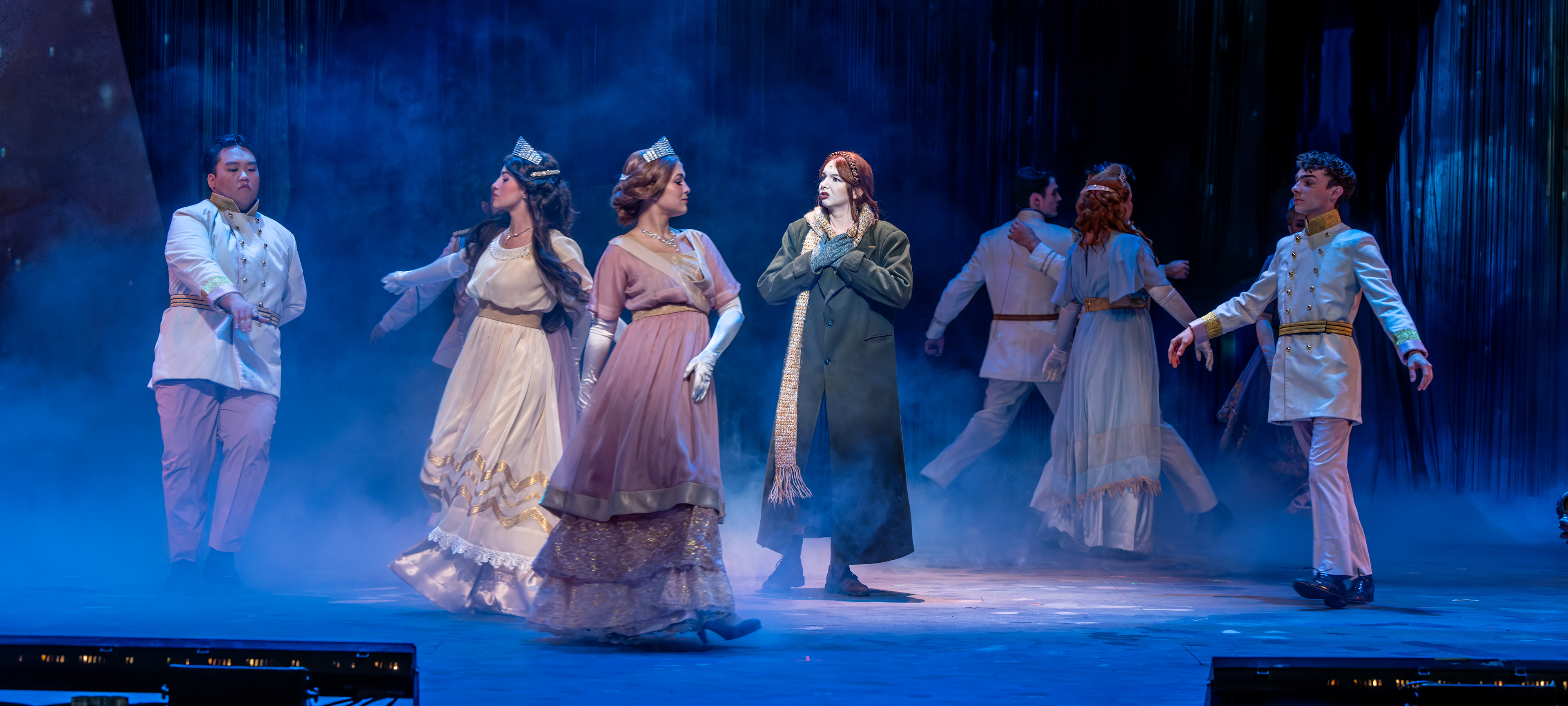 This production of Anastasia was grounded in historical authenticity, with a strong emphasis on accurately representing the period. The costume design was informed by extensive research into the clothing of each location depicted in the story. In particular, the Romanov ballgowns were inspired by period garments worn by the Romanov family and formal dress styles of the 1910s, ensuring a visually authentic portrayal that reflects the elegance and historical context of the era.