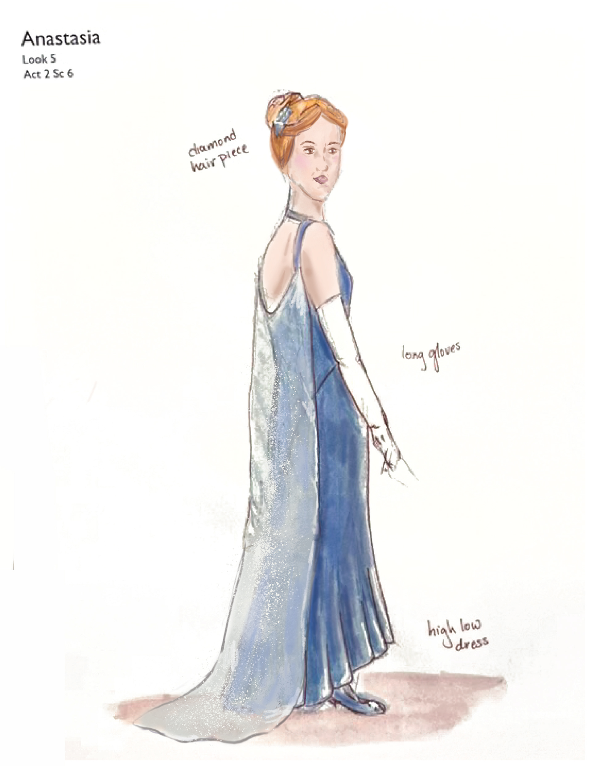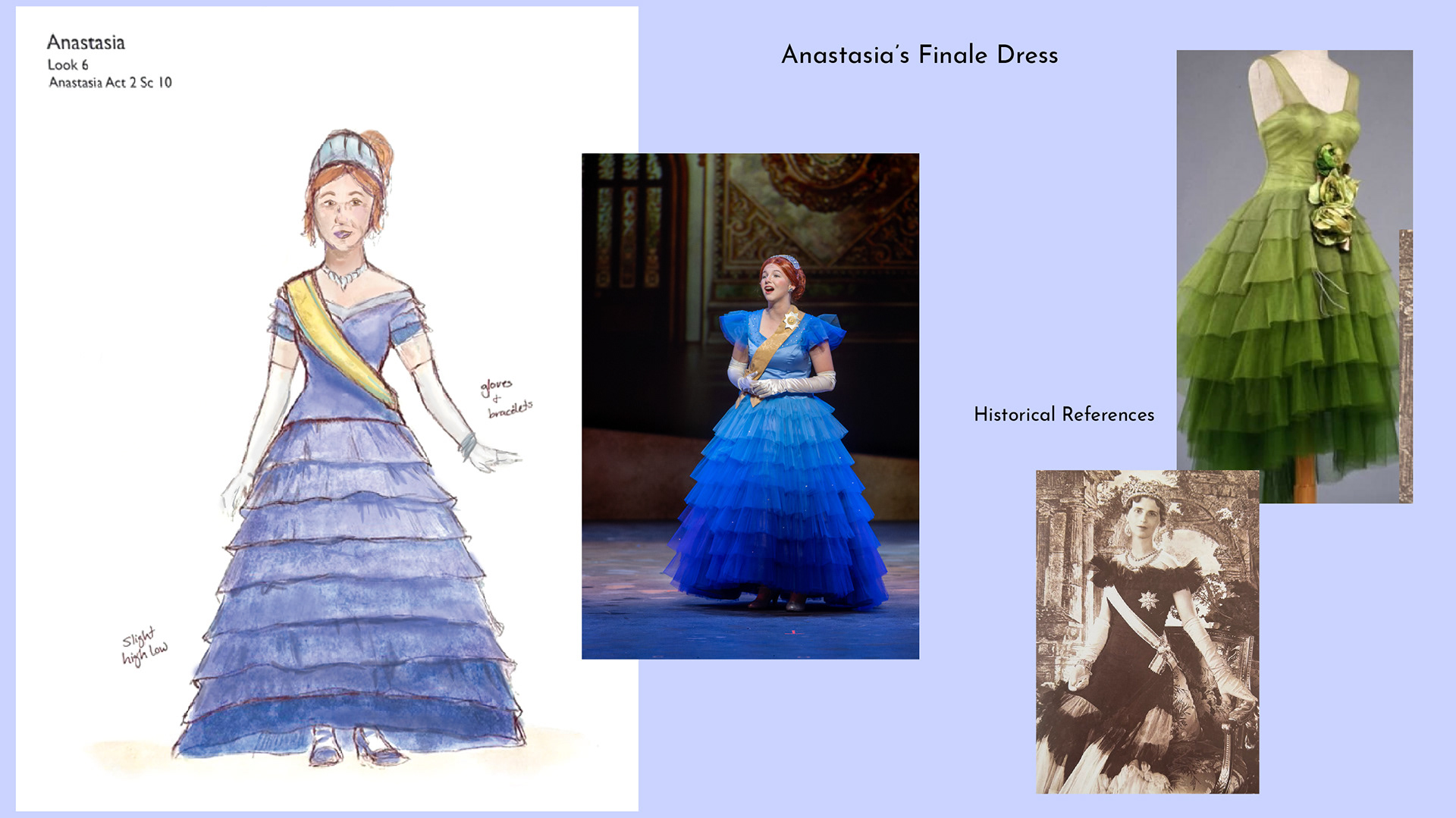 Finale dress for Anastasia was based on designer dresses from the 1920s. Then I designed a more princess shaped dress inspired by the 1920s to give the show the princess fairytale feeling.